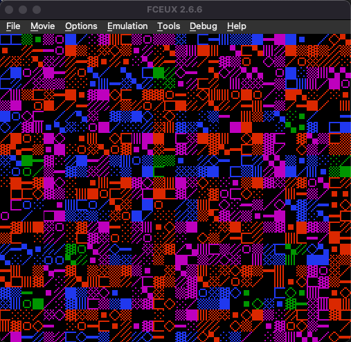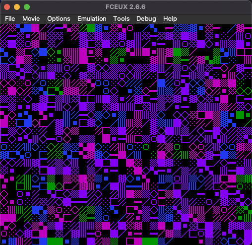 techno.s- Main audio-visual programchaos.s- Simplified variantnrom.cfg- Linker configuration for NROM mapper