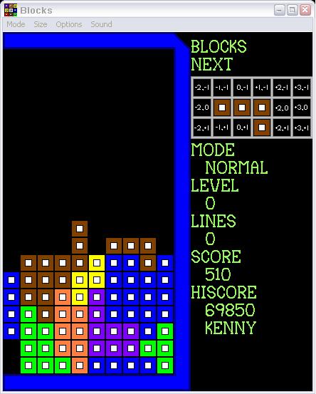 - Blocks Mode - pieces constructed from 1 - 6 bricks. 27 different pieces, including a randomly generated piece that can take on bizzare shapes. In this mode it is possible to clear 6 lines at once, earning yourself a "Block." I recommend playing it in block mode and large size for the most fun. :) Enjoy!