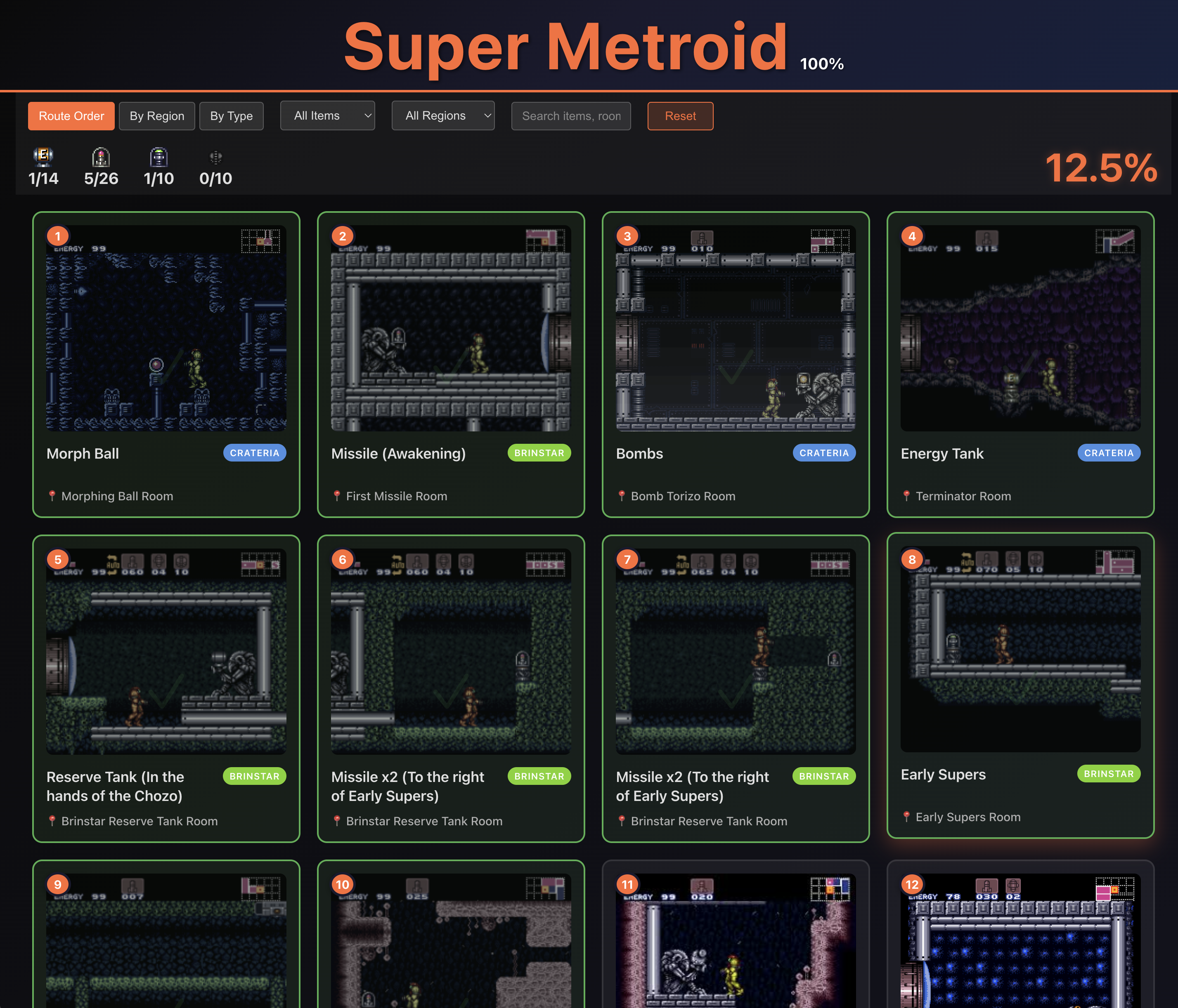 This web application helps speedrunners track their progress during Super Metroid 100% completion runs. It provides an interactive checklist of all 80 collectible items required for 100% completion, organized by route, region, or item type.