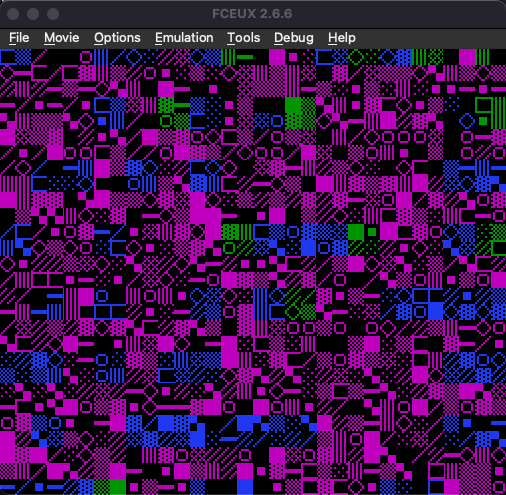 techno.s- Main audio-visual programchaos.s- Simplified variantnrom.cfg- Linker configuration for NROM mapper